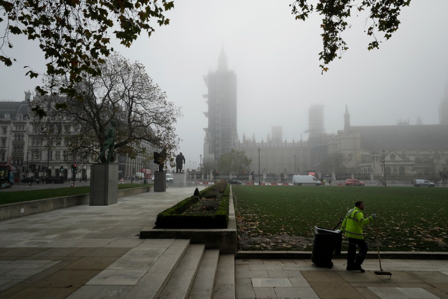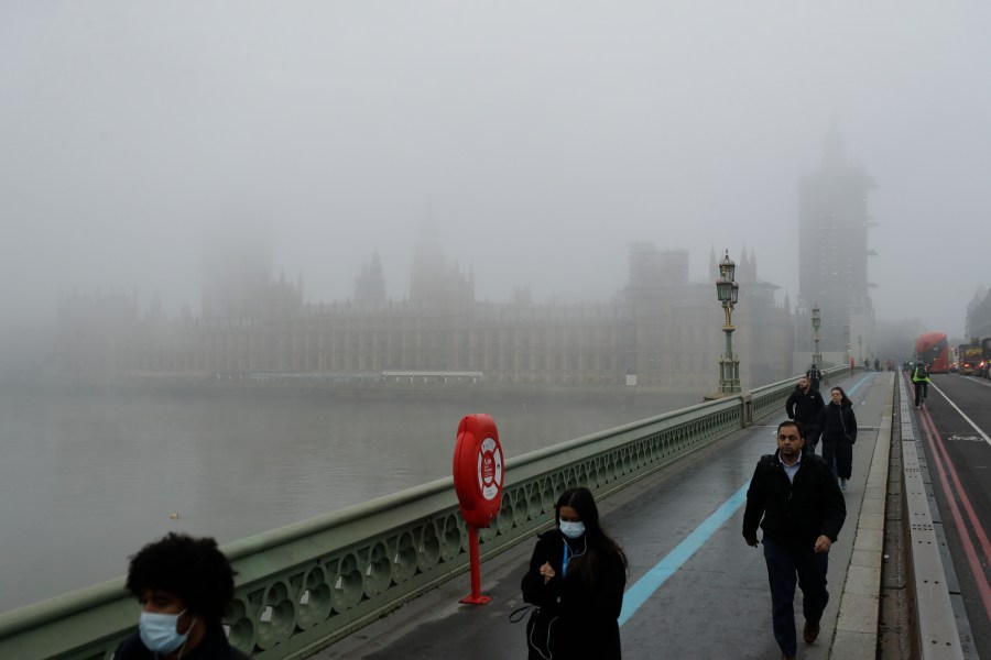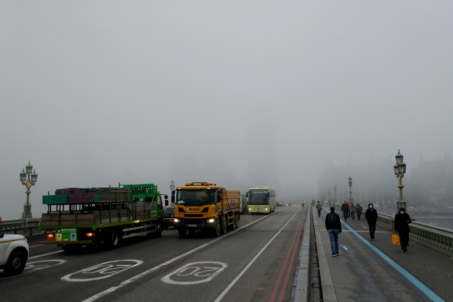 Traffic and people pass over Westminster Bridge with a fog shrouded Houses of Parliament and the Elizabeth Tower, known as Big Ben, hidden behind, on the first day of Britain’s second lockdown designed to save its health care system from being overwhelmed by people with coronavirus, in London, Thursday, Nov. 5, 2020. Britain joined large swathes of Europe in a coronavirus lockdown designed to save its health care system from being overwhelmed. Pubs, along with restaurants, hairdressers and shops selling non-essential items closed on Thursday until at least Dec. 2. (AP Photo/Matt Dunham)