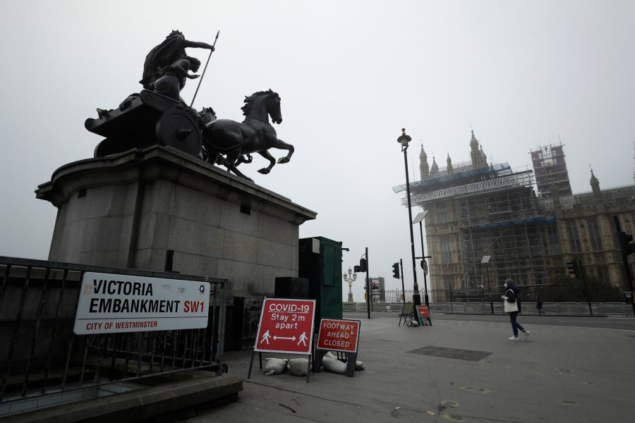 A person walks behind a coronavirus advice sign near the Houses of Parliament, on the first day of Britain’s second lockdown designed to save its health care system from being overwhelmed by people with coronavirus, in London, Thursday, Nov. 5, 2020. Britain joined large swathes of Europe in a coronavirus lockdown designed to save its health care system from being overwhelmed. Pubs, along with restaurants, hairdressers and shops selling non-essential items closed on Thursday until at least Dec. 2. (AP Photo/Matt Dunham)