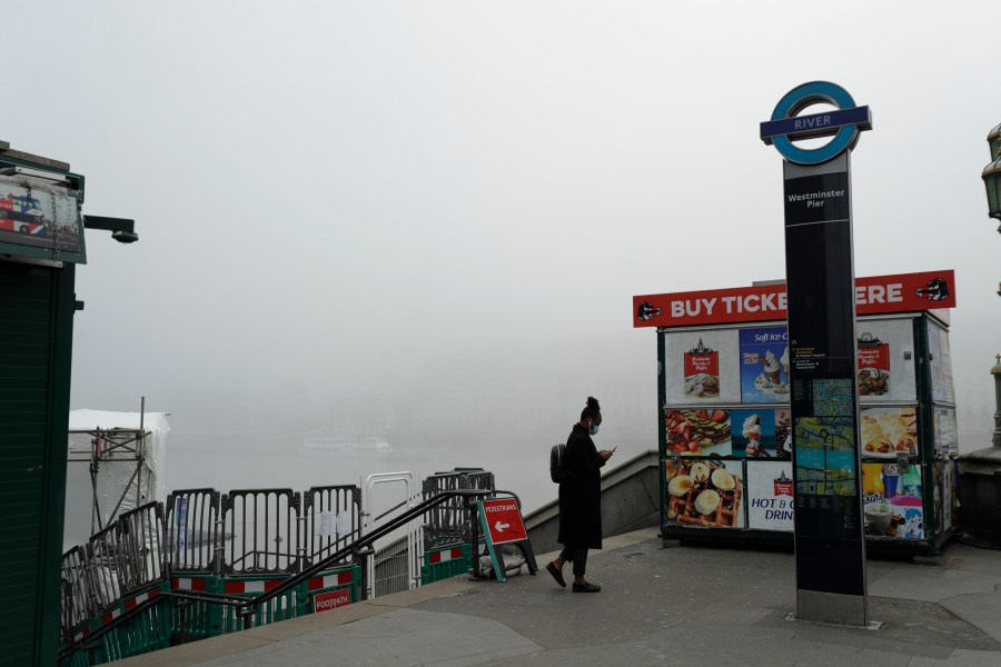 A person wearing a face mask walks past a closed tourist ticket hut at the northern end of Westminster Bridge in fog, on the first day of Britain’s second lockdown designed to save its health care system from being overwhelmed by people with coronavirus, in London, Thursday, Nov. 5, 2020. Britain joined large swathes of Europe in a coronavirus lockdown designed to save its health care system from being overwhelmed. Pubs, along with restaurants, hairdressers and shops selling non-essential items closed on Thursday until at least Dec. 2. (AP Photo/Matt Dunham)