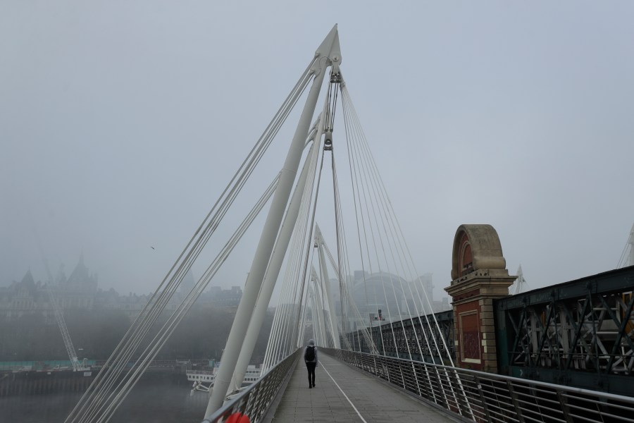 A person walk in fog over one of the pedestrian Golden Jubilee Bridges, on the first day of Britain’s second lockdown designed to save its health care system from being overwhelmed by people with coronavirus, in London, Thursday, Nov. 5, 2020. Britain joined large swathes of Europe in a coronavirus lockdown designed to save its health care system from being overwhelmed. Pubs, along with restaurants, hairdressers and shops selling non-essential items closed on Thursday until at least Dec. 2. (AP Photo/Matt Dunham)