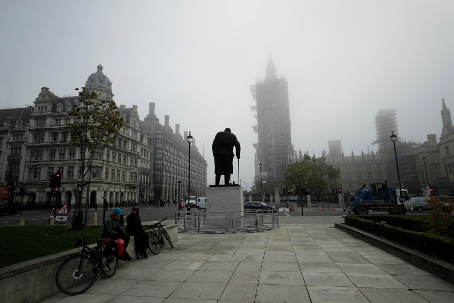 People sit talking near the statue of Winston Churchill and the scaffolded Houses of Parliament and the Elizabeth Tower, known as Big Ben, shrouded in fog, on the first day of Britain’s second lockdown designed to save its health care system from being overwhelmed by people with coronavirus, in London, Thursday, Nov. 5, 2020. Britain joined large swathes of Europe in a coronavirus lockdown designed to save its health care system from being overwhelmed. Pubs, along with restaurants, hairdressers and shops selling non-essential items closed on Thursday until at least Dec. 2. (AP Photo/Matt Dunham)