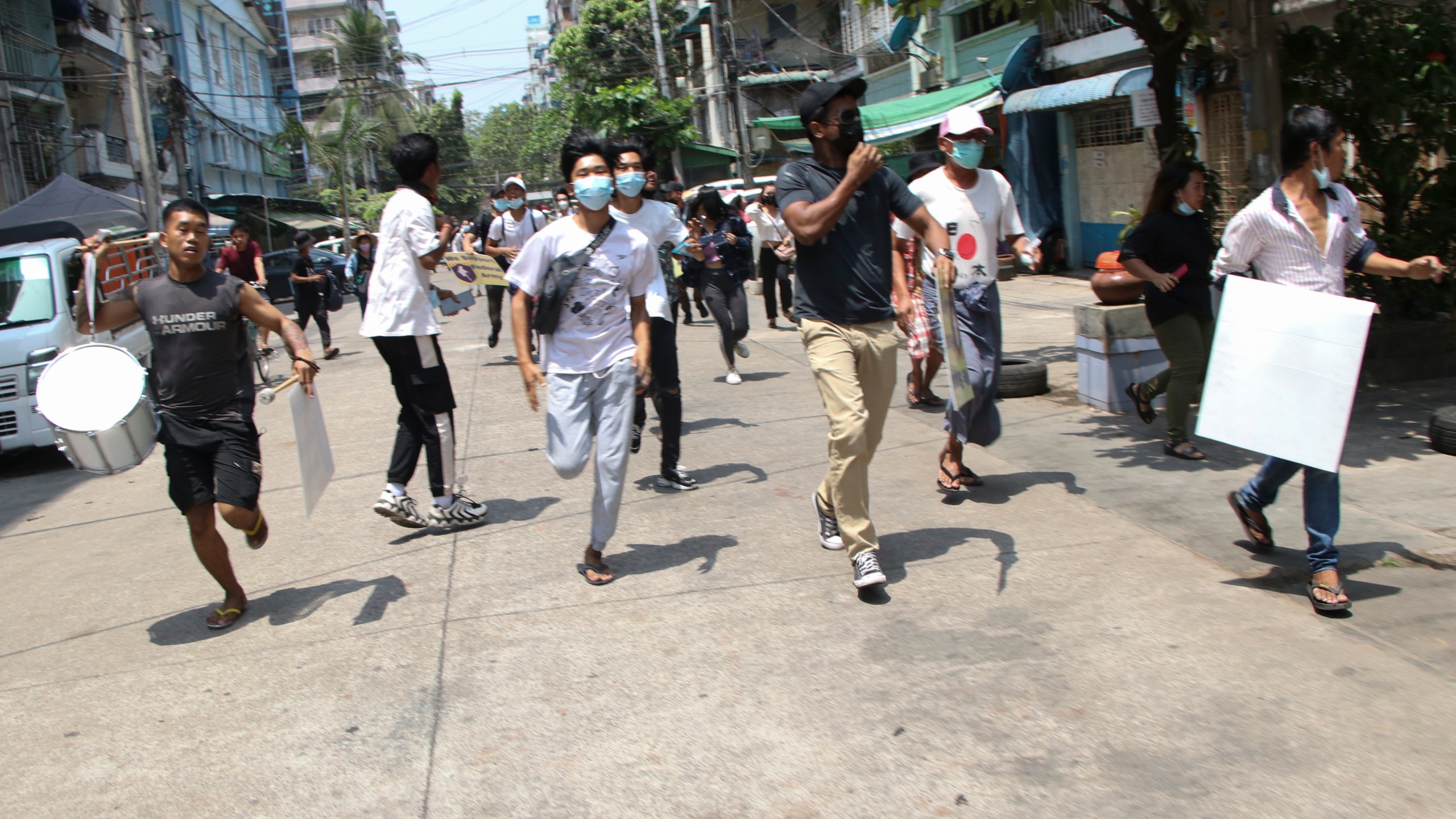 Anti-coup protesters run to avoid military forces during a demonstration in Yangon, Myanmar on Wednesday March 31, 2021. The Southeast Asian nation has been wracked by violence since the military ousted a civilian-led government on Feb. 1 and began to forcibly put down protests. (AP Photo)