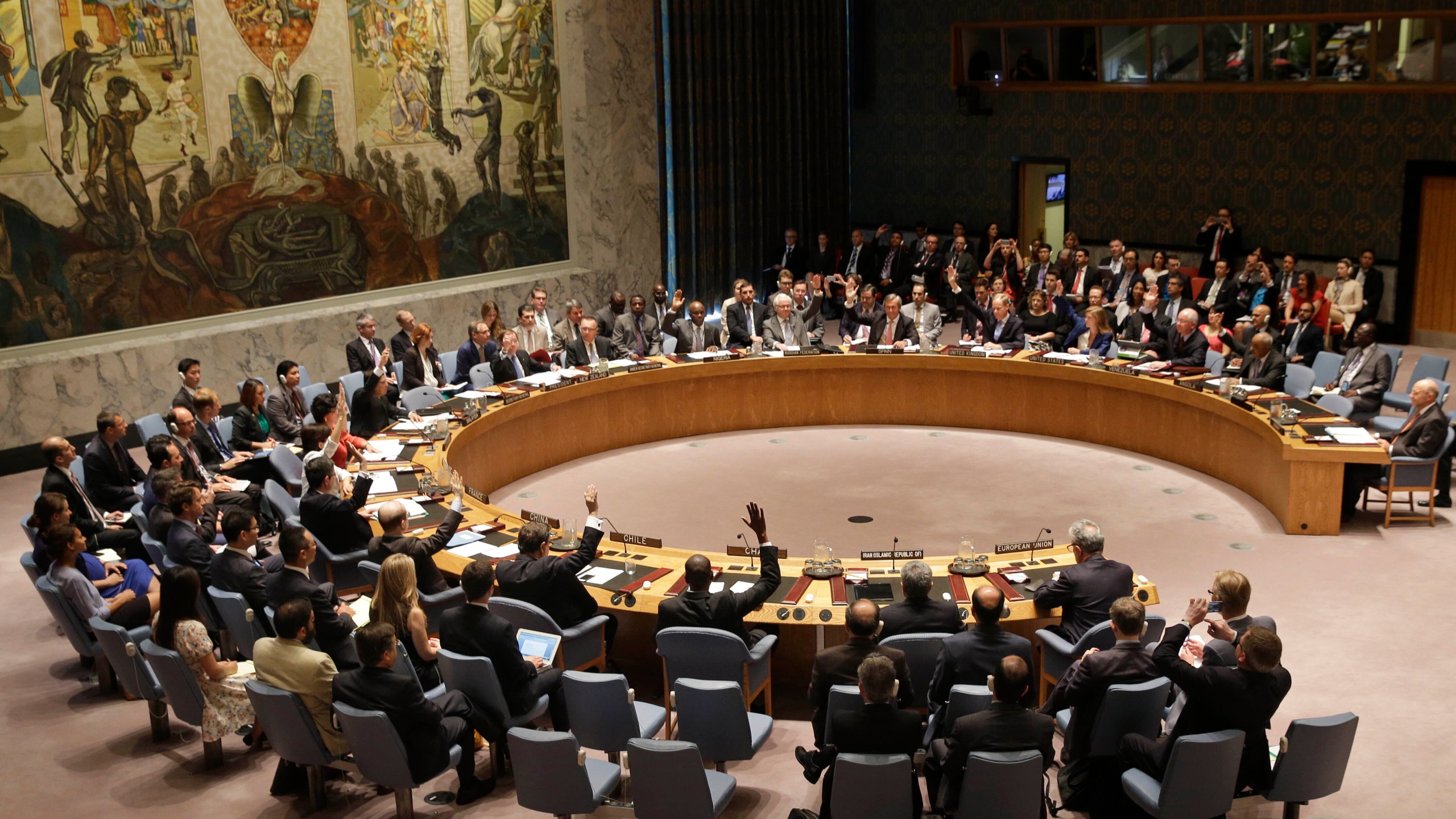FILE – In this July 20, 2015, file photo, members of the Security Council vote at United Nations headquarters on the landmark nuclear deal between Iran and six world powers. The United States is planning a new diplomatic line of attack on Iran after a resounding defeat in the U.N. Security Council. Having lost its long-shot bid to indefinitely extend an international arms embargo on Iran last week, the Trump administration is poised to call for the re-imposition of all U.N. sanctions that had been eased under the 2015 nuclear deal from which the U.S. withdrew two years ago.(AP Photo/Seth Wenig, File)