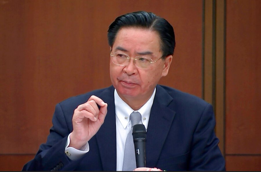 Taiwanese Foreign Minister Joseph Wu speaks during a briefing Wednesday, April 7, 2021, in Taipei, Taiwan. Wu said that China’s attempts at conciliation and military intimidation are sending “mixed signals” to people on the island China claims as its own territory to be won over peacefully or by force. (AP Photo/Wu Taijing)