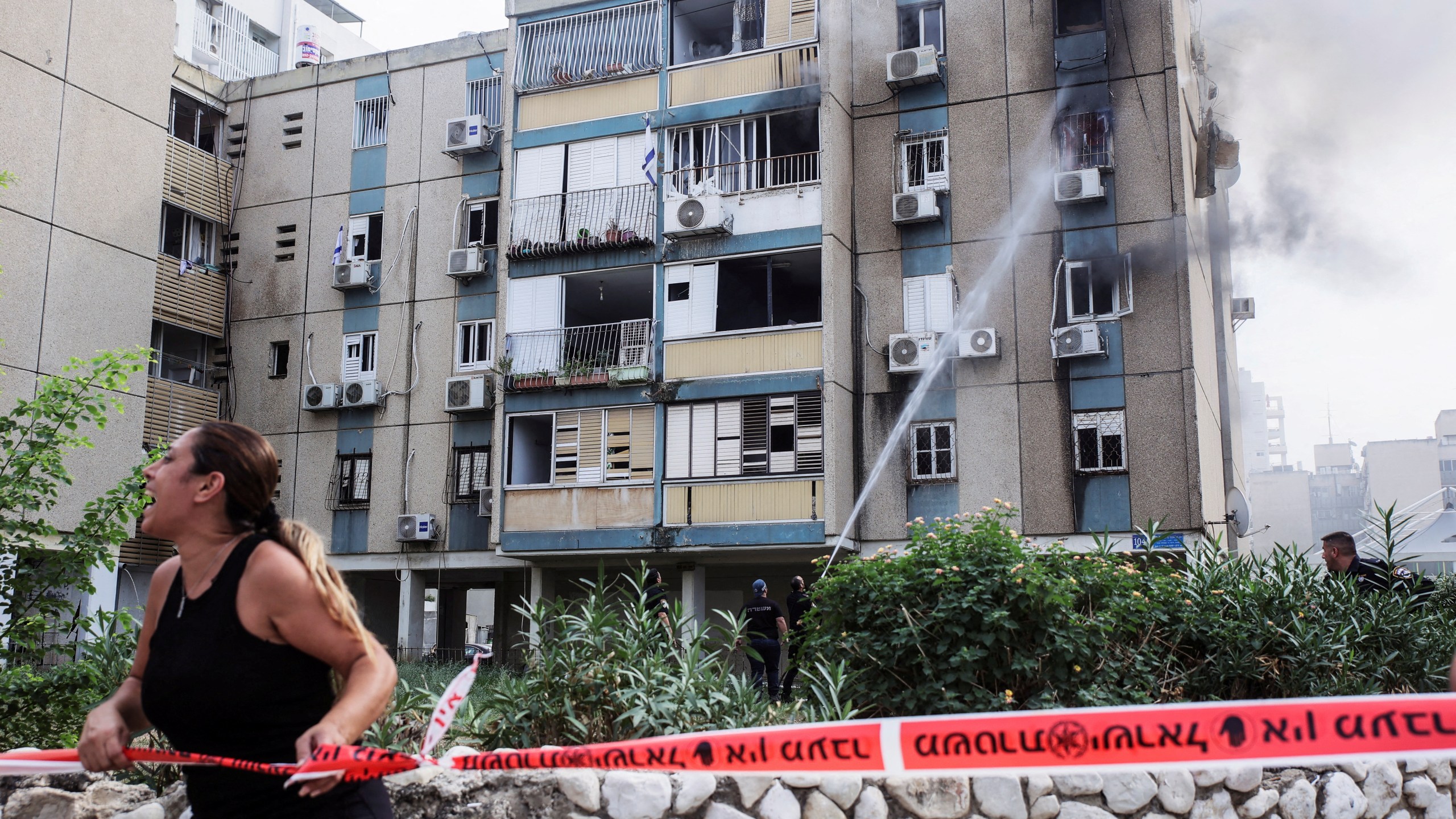 A woman calls out as smoke rises from a residential apartment building at the scene of where a rocket, fired from the Gaza Strip towards Israel, in Tel Aviv, Israel, October 27, 2023. REUTERS/Itai Ron ISRAEL OUT. NO COMMERCIAL OR EDITORIAL SALES IN ISRAEL TPX IMAGES OF THE DAY