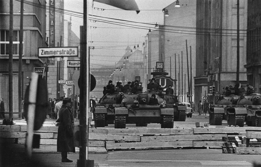 Tanks approaching a checkpoint area of the Berlin Wall. (Photo by Express Newspapers/Getty Images)