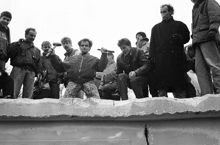 A view from the east of a Berliner posing with a hammer and chisel as the city’s inhabitants gather on the Berlin Wall to celebrate the effective end of partition, 31st December 1989. (Photo by Steve Eason/Hulton Archive/Getty Images)