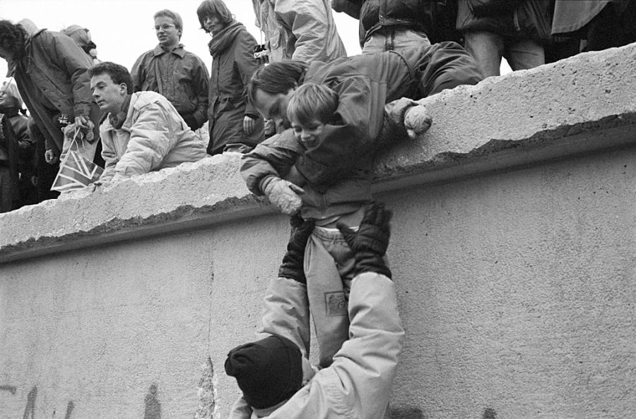 East Berliners climb onto the Berlin Wall to celebrate the effective end of the city’s partition, 31st December 1989. (Photo by Steve Eason/Hulton Archive/Getty Images)